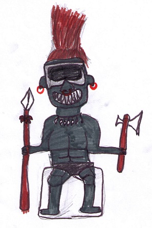 El brujo estaba tallado en piedra oscura, tenía los ojos cuadrados y grandes como si llevase unas gafas de bucear puestas, la nariz era muy ancha, con un aro enganchado en ella que hacía juego con los que le colgaban de las orejas; los aros debían de ser muy pesados; la boca le llegaba hasta las orejas, sus dientes eran tan largos como colmillos, y los de arriba encajaban con los de abajo como si se tratase de un perro de presa. El pelo, de punta, estaba hecho con fibras de palmeras o de árboles africanos. En el cuello llevaba un collar de huesos, que Pablo aseguraba que eran de niños pequeños que el brujo había matado y luego se había comido. Estaba sentado y tenía sujeto en una mano un hacha y en la otra una lanza con plumas de colores.